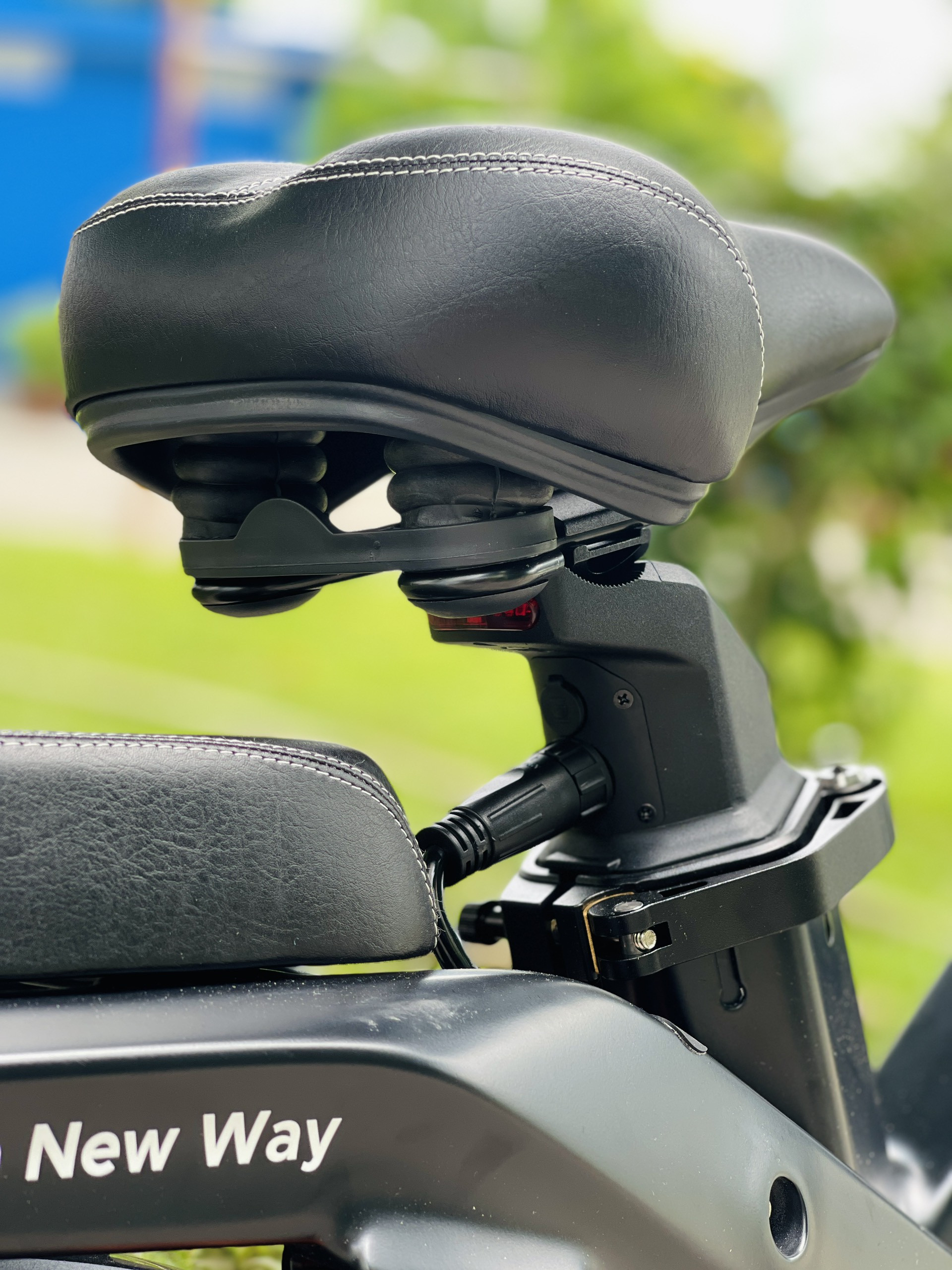 Một điểm nâng cấp đáng giá trên Engwe X20 chính là hệ thống giảm xóc ba cấp, bao gồm phuộc trước, giảm xóc giữa và giảm xóc sau. Nhờ vậy, xe có thể hấp thụ chấn động tốt hơn nhiều so với các mẫu chỉ có phuộc trước. Khi chạy qua ổ gà, đường đá hay địa hình phức tạp, người lái vẫn cảm thấy êm ái và ổn định.