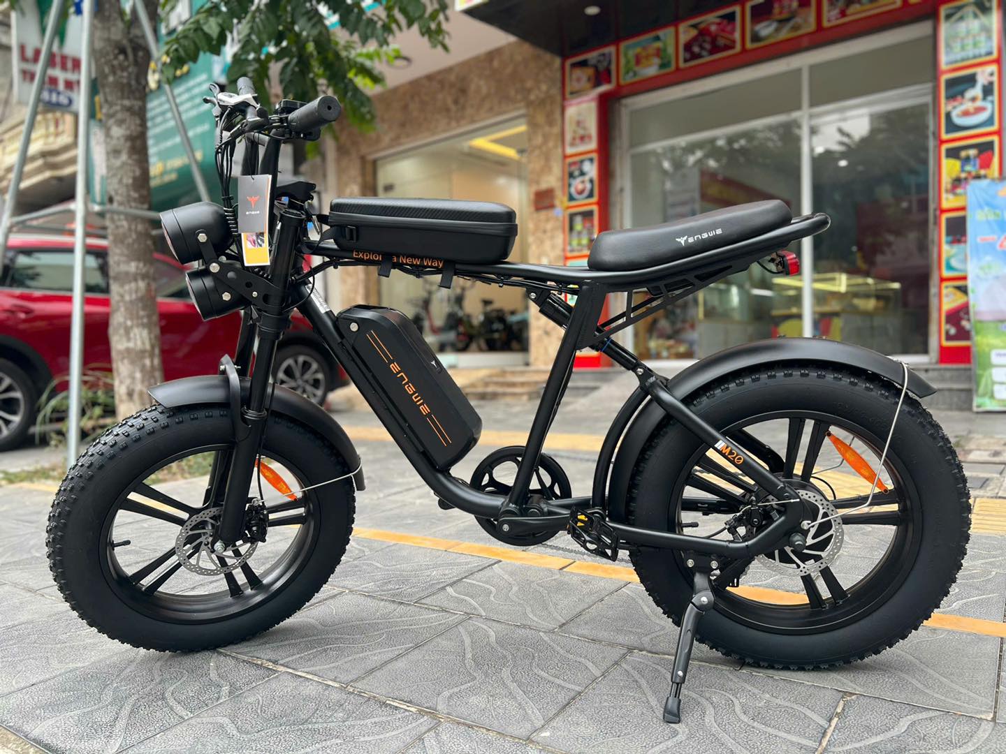 Điểm khiến M20 khác biệt chính là khả năng tùy chọn 1 pin hoặc 2 pin, cho phép người dùng đi cả trăm cây số mà không lo hết điện. Với thiết kế chắc chắn, động cơ khỏe 1000W, lại có bộ giảm xóc thủy lực, Engwe M20 phù hợp từ nhu cầu đi phố hằng ngày đến những chuyến đi xa đầy thử thách.