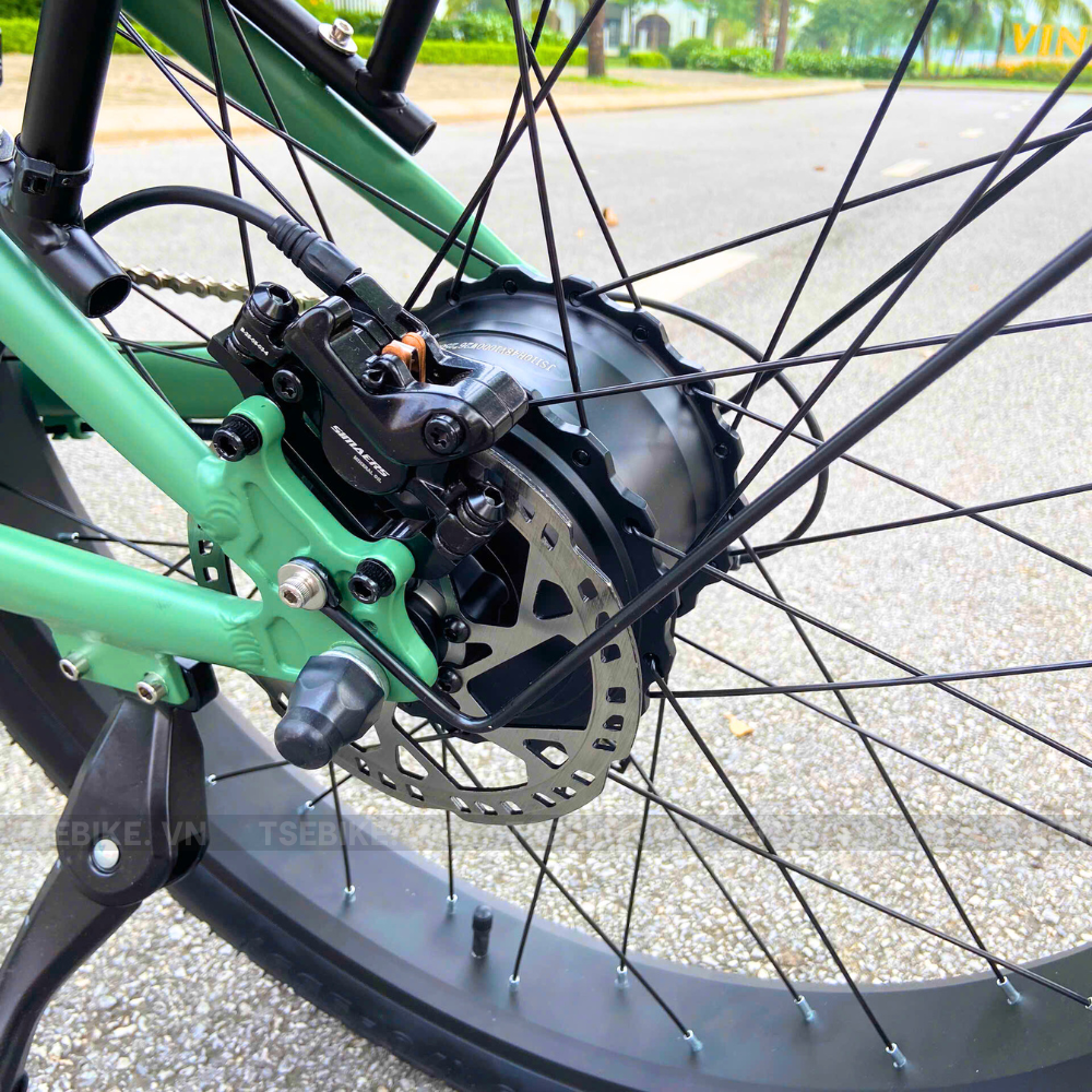 Phanh đĩa thủy lực tích hợp chức năng ngắt điện khi phanh, đảm bảo an toàn tối đa, đặc biệt khi di chuyển tốc độ cao hoặc trên địa hình trơn trượt.
